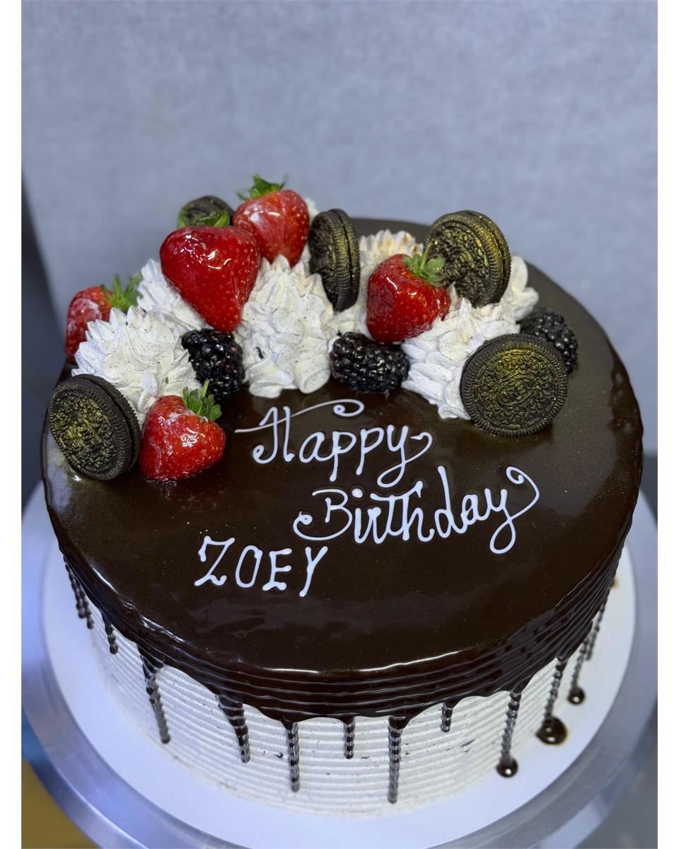 This stunning Oreo birthday cake is a true showstopper, combining elegance and indulgence in every detail. The cake is frosted with a smooth and creamy cookies and cream buttercream, finished with neat horizontal textures around the sides for a clean, modern look. Rich chocolate ganache is generously poured over the top, creating a flawless drip effect that adds a luxurious touch. The top of the cake is adorned with fresh, vibrant strawberries and blackberries, adding a burst of color and natural sweetness. Fluffy swirls of whipped cream sit between the fruit, creating height and texture, while whole Oreo cookies crown the design, tying the theme together perfectly. A hand-piped “Happy Birthday” message in white script completes the look, making this cake perfect for any celebration. Whether you''''''''''''''''re a fan of chocolate, cookies, or fresh fruit, this cake brings together the best of all worlds in one irresistible dessert.